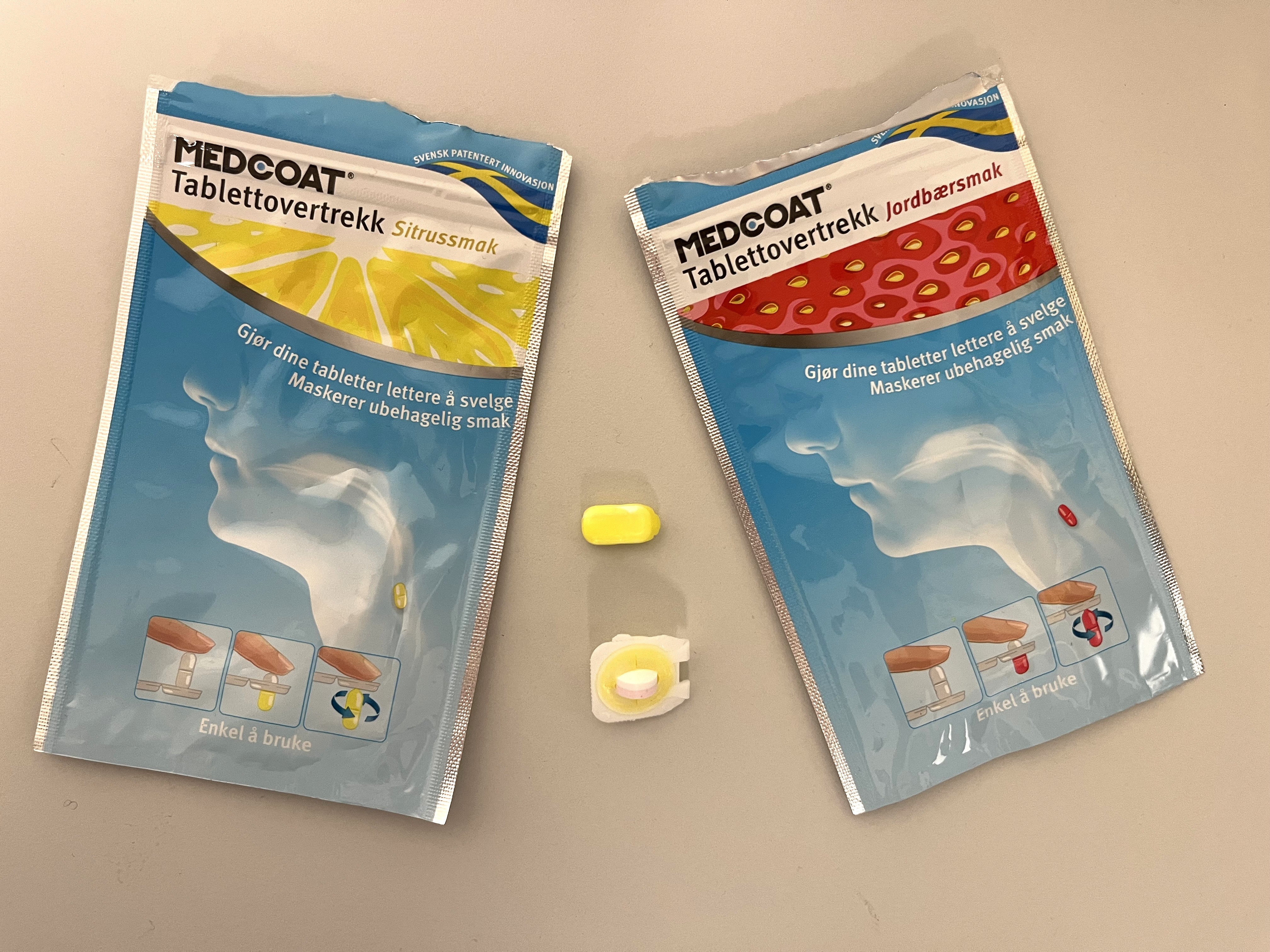 Medcoat tablettrekk (jordbær/ sitron). Bestilles til medisinrommet fra apoteket.