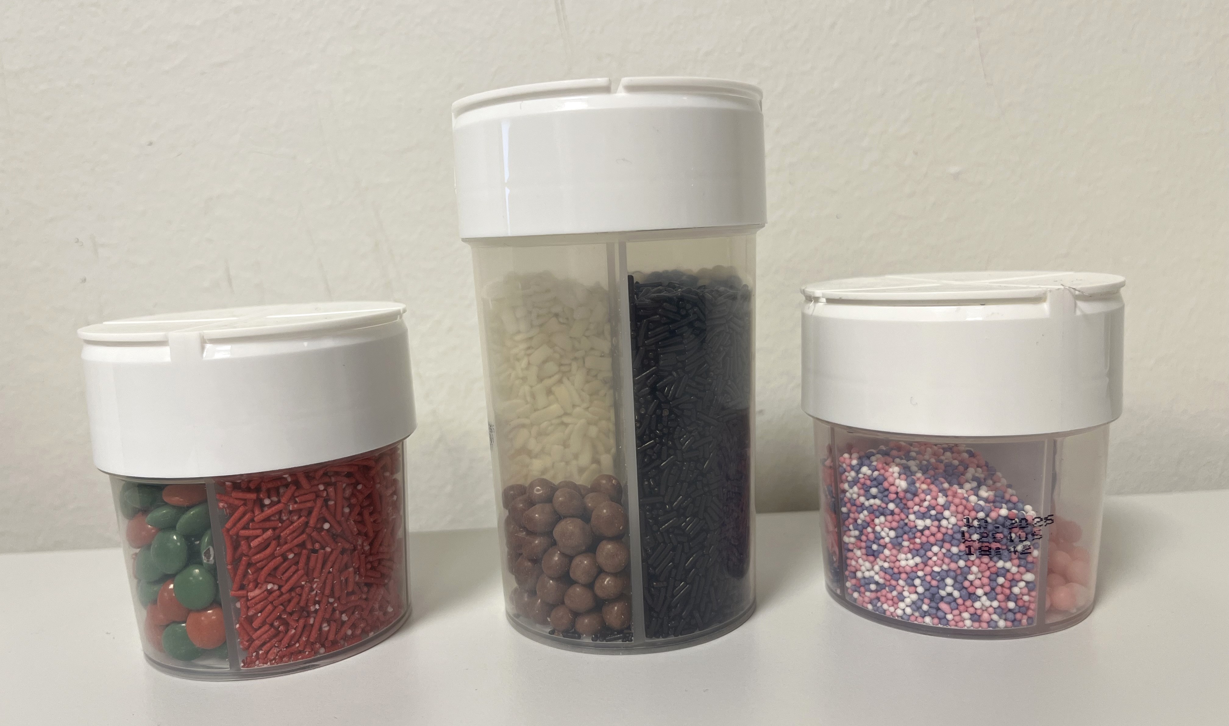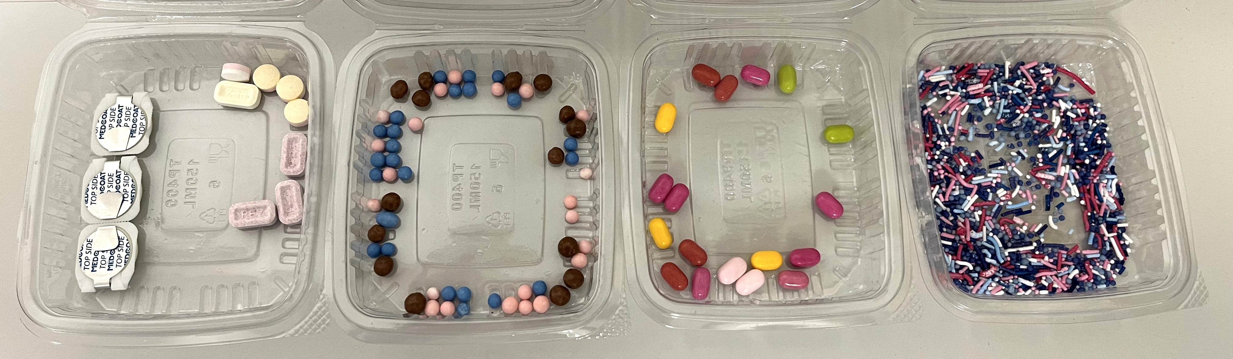Egnede små bokser/skåler å ha tablett-dummiene i når barnet skal trene.