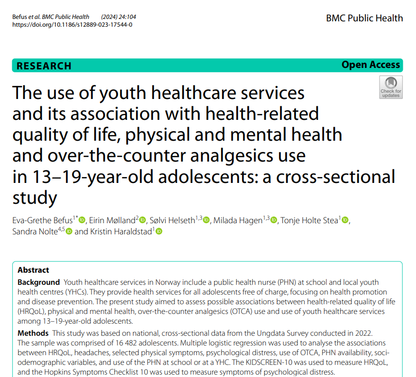 Den ene artikkelen i doktorgraden omhandler svar fra Ungdata-undersøkelsen i Agder i 2022, der 16,482 ungdommer i alderen 13–19 år deltok. Her inngikk blant annet selvrapportert psykisk helse, kontakt med skolehelsetjenesten og bruk av reseptfrie smertestillende.